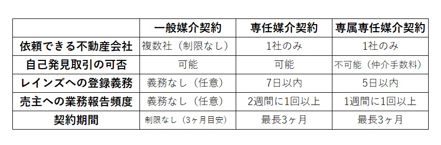 この媒介契約には主に3つの種類があり、それぞれ特徴が異なります。